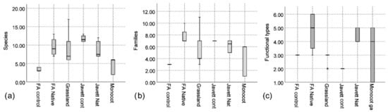 (a) The differences in yearly plant species richness, (b) plant family richness, and (c) plant functional type richness between sites, measured and compared by quadrat. The bars represent the median, interquartile range (box), and minimum and maximum (whiskers) of the total. Asterisks indicate maximum outliers.