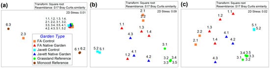 Non-metric multidimensional scaling of plots for the six gardens across quadrats indicating (a) all quadrats with summer plant cover, illustrating extreme outliers, (b) quadrats (outliers removed) with summer plant cover, and (c) quadrats (outliers removed) with winter plant cover.