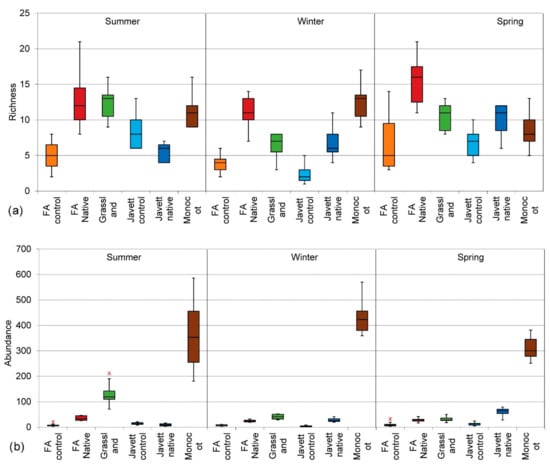 However, size and green space proportion do not explain the insect richness and diversity found. Both the grassland reference area and the Future Africa control garden are on the same premises as the Future Africa native garden (only a couple of meters away from each other), denoting similar meso-greenspace proportions (see Table 1). The Future Africa control fared poorer in some seasons in attracting both insect richness and abundance than both these gardens. The ratio of impervious surface to green space, which negatively affects insects [,], is less favorable around the Javett native and control gardens (youngest), which are also half the size of the Future Africa native garden (Table 1). This could have contributed to the poorer performance of the youngest gardens in terms of insect richness and abundance. However, habitat size and connectivity do not provide explanations for the insects that were sampled in this study.