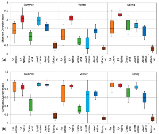 There was an overall effect on insect diversity, as indicated by the Shannon Diversity Index, in summer (H (5, N = 42) = 29.96, p < 0.001), winter (H (5, N = 42) = 30.93, p < 0.001), and spring (H (5, N = 42) = 27.92, p < 0.001) (Figure 5a). The FA native garden demonstrated a significantly greater Shannon Diversity Index across seasons and the monocotyledon reference consistently demonstrated the lowest Shannon Diversity Index across seasons. Where the other gardens were quite constant across seasons, the grassland and Javett controls fluctuated the most, both having a notably lower diversity index in winter. The FA native garden showed a significantly greater diversity index than the monocotyledon reference in summer, spring (p = 0.001), and winter (p < 0.001), and the grassland reference showed a significantly greater diversity index in summer (p = 0.011002) and winter (p = 0.009382).