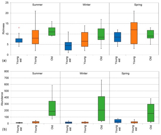 The insect species richness in relation to age (a), and the insect species abundance in relation to age (b) across seasons. * indicate maximum outliers.