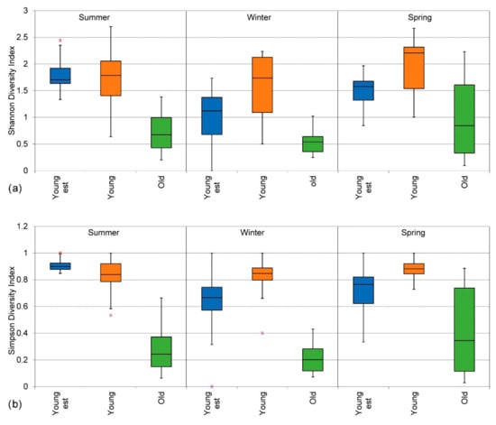 The Shannon Diversity Index (a), and the Simpson Diversity Index (b) in relation to the age of the gardens across seasons. * indicate maximum outliers.