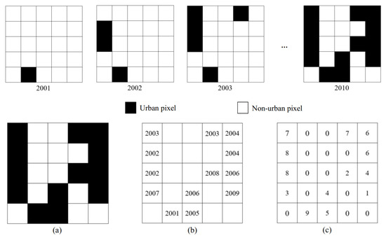 Generation of continuation period layer, with the start year of 2001 and the end year of 2010. Pixels that have been urbanized are blackened, un-urbanized pixels stay white: (a) subset of a raster binary image of the urban extent in 2010; (b) the year of urbanization tu is derived from each pixel; (c) the difference between the end year and the year of urbanization depicts the continuation period.