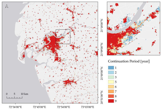 P is the key to integrating the observations with high temporal resolution. With this parameter, the temporal information of the settlement extents is incorporated. Instead of indicating the class type of the given pixel, the temporal constraint provided by P can be used to predict the urban/built-settlement growth scenarios described by assumptions (ii) and (iii). Figure 4 illustrates the continuation period layer of Surat.