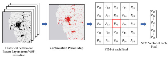 To conclude, STM vectors are generated. Compared to the currently established time-series layers stacking that would be used as inputs for predictive models [32], this feature can reduce the data volume and redundancy by integrating annual settlement extent layers into one layer.