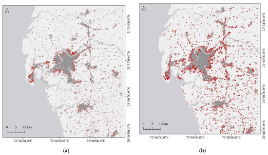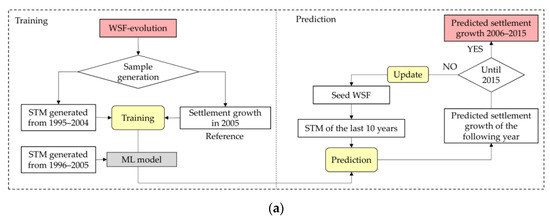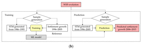 Figure 6b shows the workflow of the ten-year strategy, in which the STM for the training was generated based on historical urban layers from 1986 to 1995. The reference urban extent layer represents the urbanized pixel between 1996 and 2005. For the prediction phase, the STM generated with the annual settlement extent layers from 1996 to 2005 was used as the input, with the objective to predict the urban/built-settlement growth from 2006 to 2015.
