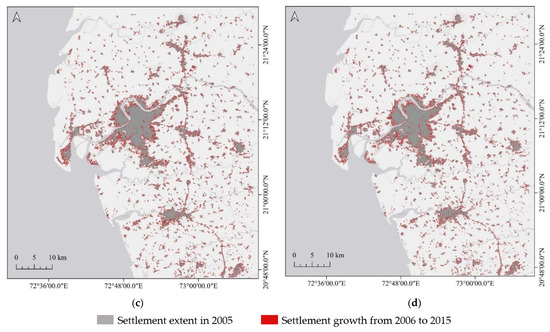 Actual settlement growth map and predicted settlement growth maps (2006–2015) of Surat, based on the STM-based model: (a) actual settlement growth map of Surat, generated from the WSF-evolution; (b) predicted settlement growth map based on the one-year strategy and RF; (c) predicted settlement growth map based on the ten-year strategy and RF; (d) predicted settlement growth map based on the ten-year strategy and MLP.