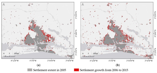 The results of the first test phase confirmed the STM’s adaptability to the different ML algorithms, with RF and MLP achieving similar accuracies. Because the STM contained intrinsic information on attracting and resisting the growth based on the spatial and temporal constraints that were derived from past developments, it allowed the predictive models to predict the growth without the need of including external spatial information layers. For example, the excluded area layers were used in the SLEUTH model in order to provide spatial resistant factors for settlement development, e.g., water masks, natural preserved regions, and planned infrastructures. The results demonstrated the STM’s ability to detect such areas without having them as input data. In all of the tests, predicted future urban expansion into water bodies was barely found. In HCMC (Figure 11), minimal growth was predicted at the airport of Tan-Son-Nhat. In the case of Abidjan (Figure 12), the growth towards the National Park Banco has been avoided. Aside from the excluded areas, the road network is also an essential factor that can potentially affect the future settlement growth by attracting settlement growth. The STM-based results shared similar road-attracted growth patterns as the results from the SLEUTH model, with only the latter having road networks as input layers. At the same time, the STM condensed the historical settlement extent layers into one continuation period layer and further reduced the data redundancy. Without considering the external layers, the STM-based model utilized only the continuation period layer as the input. In the test case of Surat, the continuation period layer took up 33 MB. In comparison, the annual settlement extent layers from the same time period took up 490 MB.