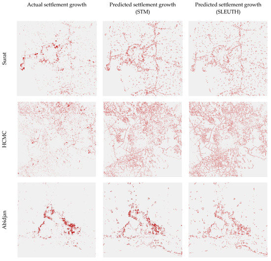 The AUC values of all of the tests exceeded 0.85, proving the good ability of the STM-based model to predict the future settlement growth. In the evaluation setting, the best results were achieved by the combination of MLP and ten-year strategy. The results of the predictive model that were based on this combination were further compared with the predicted results of the SLEUTH model. The AUC that was calculated from the STM-based approach of all three of the case cities surpassed that of the SLEUTH model, achieving 0.91 for Surat, 0.88 for HCMC, and 0.87 for Abidjan. In comparison, the SLEUTH model achieved an AUC of 0.89 for Surat, 0.84 for HCMC, and 0.83 for Abidjan (Table 5). The STM-based model was able to predict irregular growth patterns though its local pixel-based design, while the predictions of the SLEUTH model appeared to be evenly distributed (Figure 13).