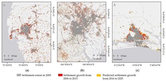 Predicted settlement growth of the case cities from 2016 to 2025 (unit: number of pixels).