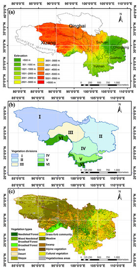 Based on China’s vegetation zoning data obtained on the Resource and Environment Science and Data Center (Table 1, http://www.resdc.cn/data.aspx?DATAID=133, accessed on 1 December 2017), it can indicate the regularity of the geographic distribution of vegetation and mainly includes three regions: the alpine vegetation region of Qinghai–Xizang Plateau, subtropical evergreen broad-leaved forest region, tropical monsoon forest and rainforest region, including 13 vegetation zones. The scattered and minor vegetation zones were aggregated into predominant vegetation types prevailing in the local areas, the regional vegetation zoning data were aggregated into six major sub-regions consisting of the alpine vegetation region, the east region, northwest region, west-central region and northwest region of subtropical evergreen broad-leaved forest and tropical monsoon forest (Figure 1b).