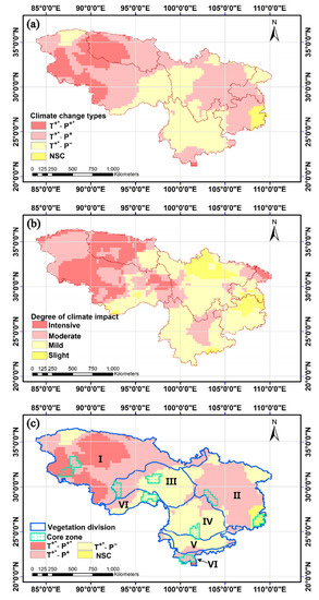 (a) Spatial distributions of climate change types, (b) the degree of climate impact and (c) the core region of the climate change model in the study region of southwestern China. Climate change types: T+*-P+*, the type with a significant increase in temperature and precipitation; T+*-P−, the type with a significant increase of temperature was related to the decrease of precipitation; T+*-P+, the type with a significant increase of temperature was related to the increase of precipitation; NSC, the type with no significant change.”+/−” means an increase/decrease in temperature or precipitation; “*” significant at p < 0.05.