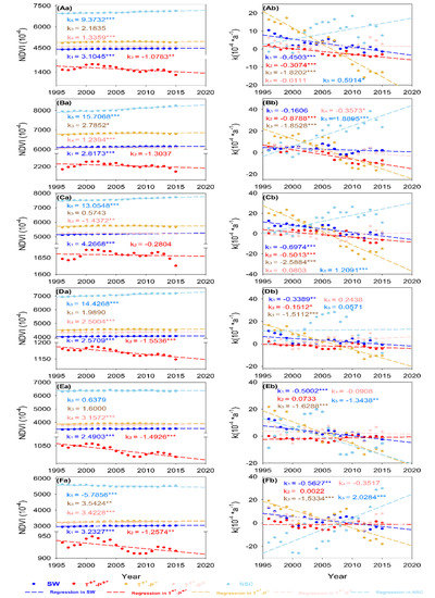 Interannual variation characteristics of NDVI and interannual trend k over 15 years of sliding. Capital letters (A–F) represent Mean, P100, P75, P50, P25 and P5, respectively, and small letters (a,b) refer to the NDVI and interannual trend k over 15 years of sliding. Numbers 1–5, respectively, represent the SW, T+*-P+*, T+*-P−, T+*-P+ and NSC.