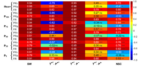 The correlation between temperature (except P100 and P75) increased, while the correlation between precipitation (except P50) decreased; the results showed that in the whole SW region had different responses to climate factors in different periods, at P100, P75 and P25 showed a decreasing trend, while Mean, P50 and P5 showed an increasing trend (Figure 5). In the T+*-P+* area, the influence of temperature gradually decreased, while precipitation significantly increased, and the combined effect of the two shows a significant increasing trend. In T+*-P− area, the correlation between NDVI (except P75) and climate factors decreased significantly at a rate of more than 0.06/(10a) (p < 0.05); and the correlation between temperature (except P100) and precipitation (except P75) decreased at a rate of more than 0.03/(10a), indicating that the correlation between the single factor and multiple correlation factor in T+*-P− area decreased. In T+*-P− area, the growth of vegetation was significantly increased by temperature, decreased by precipitation, and increased by both. In the NSC area, the correlation between NDVI and climate factors decreased significantly at a rate of more than 0.10/(10a); the correlation between temperature decreased significantly (except P100), while the correlation between precipitation increased significantly, indicating that the influence of temperature significantly reduced the vegetation, but significantly increased by the influence of precipitation, showing a significant downward trend under the combined influence of both.