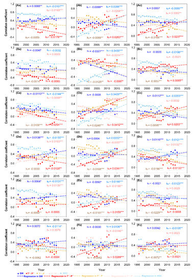 Change trend of the correlation coefficient between NDVI and temperature and precipitation over 15 years of sliding. Capital letters (A–F) represent Mean, P100, P75, P50, P25 and P5, respectively. Small letters (a–c) refer to the partial correlation coefficient and the multiple correlation coefficient between NDVI and temperature and precipitation. Numbers 1–5, respectively, represent the SW, T+*-P+*, T+*-P−, T+*-P+ and NSC.1–5 respectively represent the SW, T+*-P+*, T+*-P−, T+*-P+ and NSC. “*”, “**”, and “***” indicate the significance of p < 0.1, p < 0.05, and p < 0.01, respectively.