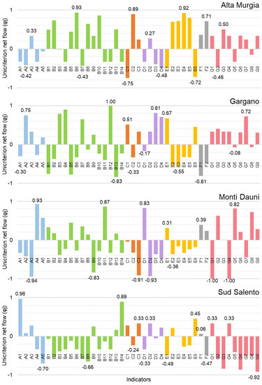 is the unicriterion net flow obtained when only the criterion is considered. This flow indicates how an alternative a is outranking () or outranked () by all the other alternatives on only the criterion . The unicriterion net flow value range between −1 (worst possible value) and +1 (best possible value). This disaggregated view of the strengths and weaknesses of an alternative is very useful to define its profile, which consists of the set of all the single criterion net flows as follows: [27]. The profile of an alternative enables the researcher to investigate the performance of the inner areas on any indicator and each thematic dimension, where to direct collective policy actions for improving the recovery and resilience of Apulian inner areas.
