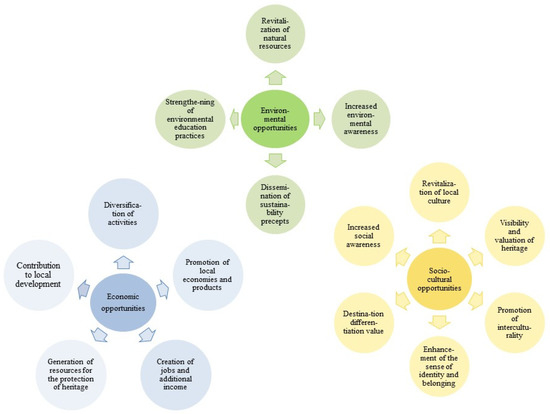 In this sense, the condition of tourism as a vector of inter-cultural dialogue is evident, as well as its capacity to make heritage visible and accessible, thus promoting numerous opportunities from a cultural, economic, and environmental point of view [58,59,60,61,62,63,64,65,66,67], as shown in Figure 1.