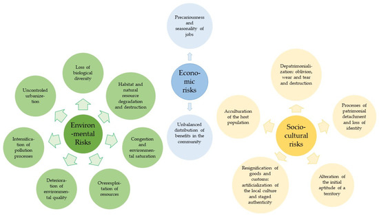 In short, both tourism and heritage can benefit as long as they are managed according to ethical and sustainable principles [58] to avoid, as far as possible, the problems of degradation and destruction, as well as those associated with the loss or falsification of customs and traditions [68,69,70,71]. These problems have been accentuated by the promotion of mass tourism [72]. Figure 2 shows the various risks derived from this activity, which are classified as environmental, sociocultural, and economical: