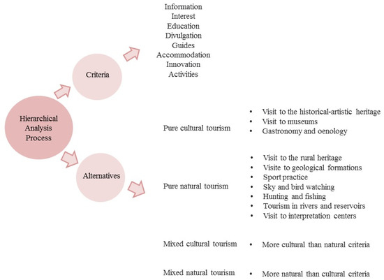 For this purpose, eight variables have been established as criteria, which correspond to the questions of a questionnaire asked to the demand: (a) information provided; (b) interest in raising awareness coming from the agents involved in the dissemination of heritage; (c) projection of heritage education; (d) dissemination of heritage attractions; (e) professionalism of tourist guides; (f) quality of accommodation; (g) innovation of interpretation centers, and (h) offer of complementary activities. On the other hand, the alternatives correspond to four different types of tourism, which are the most representative in Extremadura and are useful for identifying the tourist profile: pure nature tourism, mixed nature tourism, pure cultural tourism, and mixed cultural tourism. Figure 4 shows the scheme that summarizes this method.
