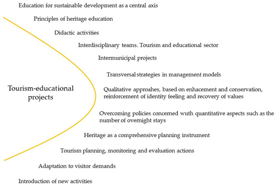 In this sense, the literature begins to include heritage education in tourism activity, disseminating the concept of tourism as a pedagogical phenomenon and potential learning agent [96,97]. Tourism activity offers interesting opportunities to promote teaching and learning processes, generate civic values, as well as to favor the recovery of heritage through tourism awareness [98,99,100,101,102]. However, these potentialities have not yet been sufficiently exploited [103]. Therefore, it is essential that the tourism management model contemplates the integration of educational strategies in tourism projects, considering heritage education as an indispensable strategy for a responsible, conscious, and quality management of destinations [41,89].
