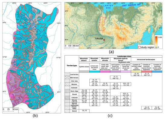 For these purposes, a holistic approach of geosystemic and morphological landscape concepts is used, which defines a landscape as a model organized by a spatio-temporal combination of environmental components and landscapes of a lower hierarchical rank. These environmental components can be categorized into lithogenic, hydrogenic, climatogenic, biogenic, and anthropogenic ones [13]. The landscape maps are developed by determination of spatial configuration of these components in the form of environmental variables in accordance with available geospatial data and knowledge. These landscape concepts are used for the hierarchical classification by applying the holistic approach [14]. In general, each region of the world has adopted different landscape typology, depending on regional or local characteristics of ecosystems, landscape concepts, and taxonomic organization approaches, or adapted to the needs of land management. On the territory of Yakutia (Eastern Siberia), the concept of permafrost landscapes has long been used in a system with a heuristic structure, divided into horizontal and vertical subsystems according to certain distinctive features inherent in its components [15,16]. One of the unique features of these landscapes is the presence of permafrost, which is reflected in the typology. As for territories located in the permafrost zone (of cryolithozone), the development and dynamics of landscapes are largely determined by the properties of permafrost as a leading element of the lithogenic component (distribution, ground temperature, active layer, cryogenic process). Therefore, the definition and concept of permafrost landscapes was used for this study [17].
