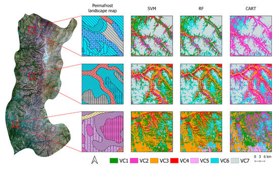 Table 4 shows the accuracy of the classification results obtained using the three classifiers. OA and kappa by SVM were 85.7% and 0.74, respectively. While the RF classification accuracy was acceptable, the PA and UA of some vegetation classes were not high. For RF, stumpy results were recorded in the class of tundra vegetation (VC6) and shrub vegetation (VC3). For CART, a high proportion of confusion was found in forest vegetation (VC1), valley vegetation (VC4), and tundra (VC6). CART greatly reduced the proportion of VC1 due to tundra and shrub vegetation (VC3).