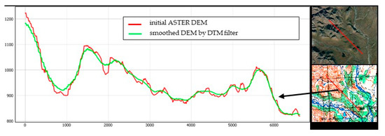 We already used the method of landform classification at the local level with the topographic position index (TPI) [58]. The slope degree and TPI [59] was used to perform landform classification from improved version 3 of Advanced Spaceborne Thermal Emission and Reflection Radiometer (ASTER) Global DEM with 30 m spatial resolution. In total, the study region covers a mosaic of 22 clipped scenes. The resulting mosaic of scenes had a number of anomalous values that were eliminated using the DTM filter tool in SAGA GIS. The artifacts were assigned a null value, then the contours were created with a step of 15 m, and the values were interpolated. In addition, with the help of bilinear interpolation and slope-based filtering, we removed adjacent cells with a large difference in elevation, which could hardly be caused by real terrain conditions. The filter determines the allowable height difference between two cells as a function of the distance between cells [60]. The procedure is performed in two steps in SAGA GIS and GRASS GIS. The result of DEM preprocessing is presented in Figure 4.