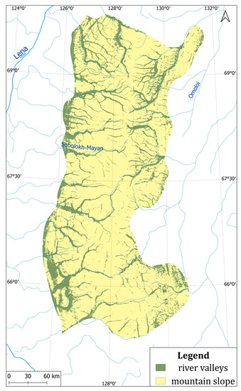 A low percentage of intrazonal mountain tundra coverage is obtained because there is practically no river alluvial sediment in the glacial valleys. Therefore, at the level of landscape classes, the identification of glacial valleys is practically very difficult. The exception is some relatively gentle narrow area in small rivers. This property of glacial valleys in Verkhoyansk Mountains was distinguished by Nikolin [63]. The penetration of forests along the river valleys into the depths of the mountain range can be associated with the thermal effect of tectonic faults. Tectonic faults play a significant role in the spread of forests along river valleys as additional sources of heat from the internal energy of the Earth, which is also evidenced by numerous ice floes.