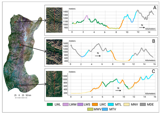 Hypsometric longitudinal landscape profiles on the Orulgan ridge: (A) (129°16′46″ E), (B) (127°59′15.4″ E), and (C) (126°40′48.6″ E).