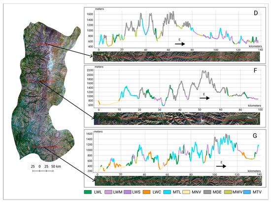 Hypsometric latitudinal landscape profiles of the Orulgan ridge: (D) (69°08′00″ N), (F) (67°35′01.0″ N), and (G) (66°19′51.0″ N).