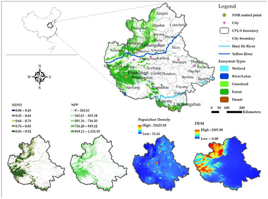 The location, the DEM, population distribution, ecosystems, and ecozone in the ecospace of CPUA.