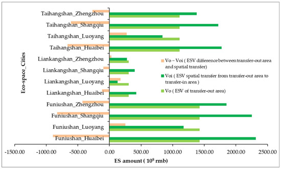 As shown in Table 6, CPUA, Vo, and ecospace ES potentials measured in monetary value for transfer-out were 2839.85 × 108 rmb, which concentrated in three ecological barrier regions represented by Funiushan, Liankangshan, Taihangshan, respectively. Among the ecospaces, Funiushan had the most ES potential at 1424.22 × 108 rmb, while Liankangshan had the least ES potential at 304.66 × 108 rmb. The four cities with high population had ES 454.45 × 108 rmb for transfer-in (Vi), with Huaibei having the least ES at 8.26 × 108 rmb, while Luoyang had the most ES at 374.85 × 108 rmb.