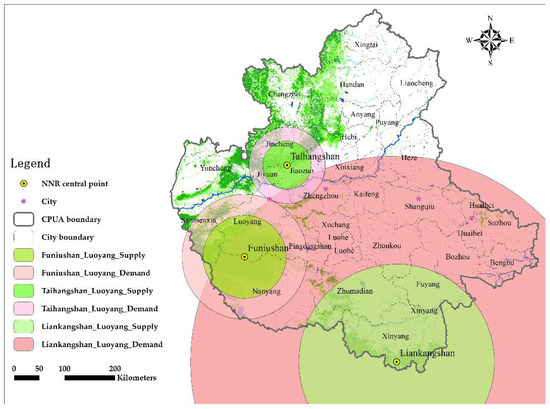 Boundary of ES demand: Buffer analysis was performed on the ArcGIS10.5 platform with the core points of ecospace, i.e., Liankangshan, Funiushan, and Taihangshan, as the center of the circle and the straight-line distance (Doi) from the ecospace core point to population center points, i.e., Luoyang, Zhengzhou, Shangqiu, and Huaibei, as the radius.