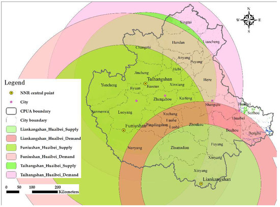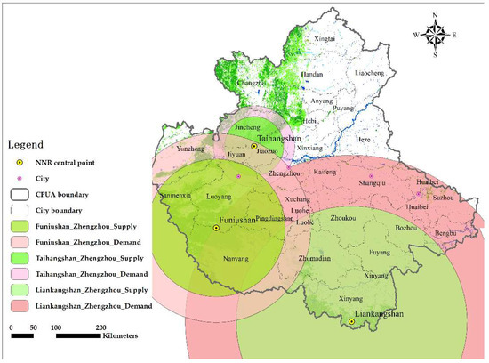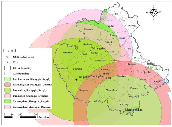 As shown in the Table 7, based on breaking point model and spatial maximum boundary determination conditions, we found that the ES spatial transfer association groups generated in the actual transfer were Funiushan_luoyang, Liankangshan_Luoyang, Liankangshan_Zhengzhou, and Taihangshan_Luoyang. Their actual Do are 82.27 km, 193.73 km, 256.67 km, and 47.86 km, respectively. The maximum radius (Dmax) was used to predict the spatial transfer radius of the other ES spatial transfer association groups, and the maximum transfer radius ranged from 65.79 km to 332.38 km for the ES spatial transfer boundary and ES demand boundary.