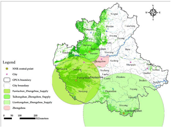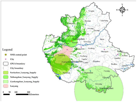 Although the ES of the three ecospaces did not spatially transfer to the corresponding urban centers, when we integrate the ecospace ES supplies to Luoyang (Figure 7), Zhengzhou (Figure 8), Shangqiu (Figure 9), and Huaibei (Figure 10), we find that the integrated actual transfer scope of ES still covers several population centers, such as Jiaozuo, Jincheng, Luohe, Zhoukou, Bozhou, Fuyang, Xinyang, and Zhumadian. If auxiliary effective ecological system construction and the ecological system management is “a porter”, the ES transfer boundaries of the ecospace can cover most of the population centers, which potentially means that the ecospace can transfer the ES from the remote ecospace to the population centers. By such remote connecting, home delivery of ESs from an ecospace faraway could be achieved.