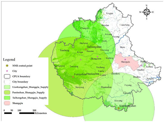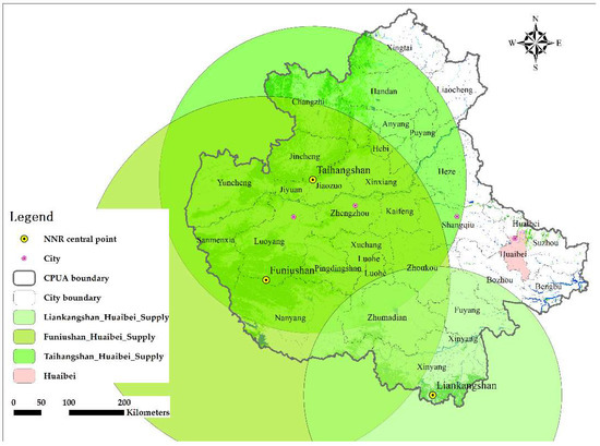 The core point of population centers (the ES transfer-in area): The population is mainly concentrated in the urban built-up area, which overlaps with the urban center in space. In order to make ES demand represent the whole region, an urban development belt, from west to east, and Luoyang, Zhengzhou, Shangqiu, and Huaibei are selected as four representative cities. These four cities have a concentrated population and run through the whole CPUA in space, which could cover the whole CPUA ES demand in space and scale. From the view of people’s demand for ES, we set the population centers, as well the city core point, as the center of the ES transfer-in area.