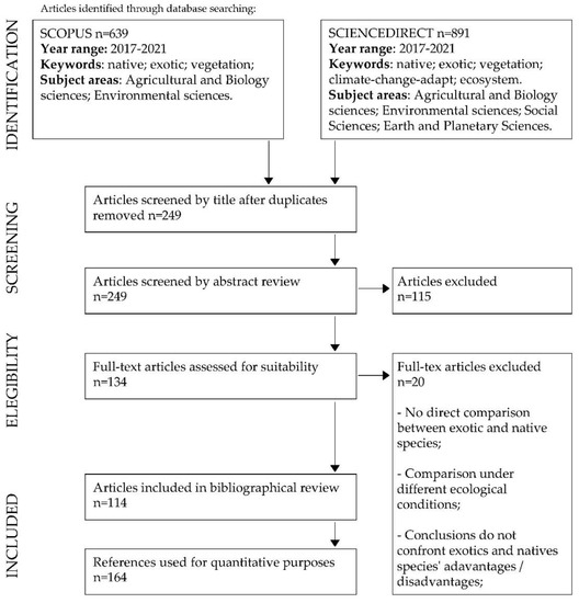 For Scopus, we used a combination of the following keywords: native, exotic, and vegetation for a broader search range. For ScienceDirect, we used native, exotic, and vegetation, associated with ecosystem and climate-change-adapt for a more detailed search.