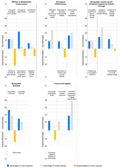 The selected papers were then divided into five major interconnected themes that reflect the aspects on which exotic and native plant species are compared: (i) Effects on Biodiversity Conservation; (ii) Ecological Performance; (iii) Ecosystem Resilience and Adaptive Capacity to Climate Change; (iv) Ecosystem Services; (v) Cultural Perception. Although this division might be subjective as there is a strong interinfluence and interdependence between them, it allows for a clearer view of the aspects according to which type of vegetation prevails over the other.