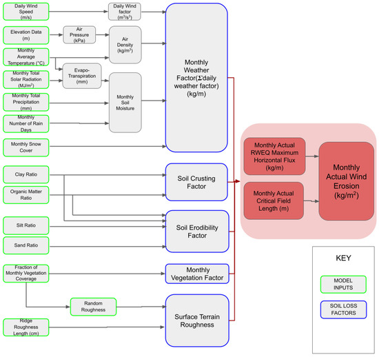 The following supporting information can be downloaded at: https://www.mdpi.com/article/10.3390/land11081204/s1, Figure S1. Percentage change in soil loss from current data to a future extreme climate scenario; Figure S2. Monthly weather factor (WF); Figure S3. Erodible fraction (EF); Figure S4. Soil crusting factor (SCF); Figure S5. Monthly surface terrain roughness (K’); Figure S6. Monthly vegetation factor (COG); Table S1. Correlation of model inputs to weather factor.