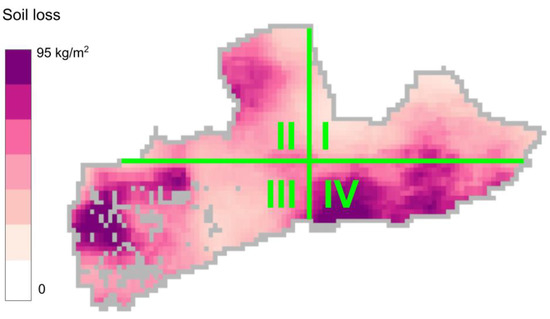 Map of annual soil erosion in our area of interest split into four quadrants corresponding with rows of Table 3. For each quadrant, the spatial maximum and minimum soil erosion are represented as categories according to Zhang [16].