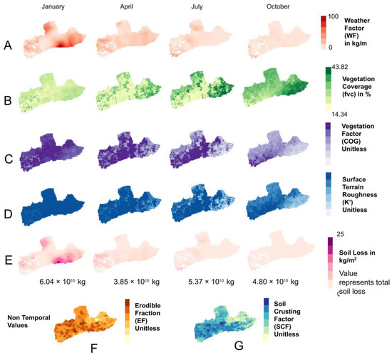 Soil loss factors per season. Inputs are monthly; this figure highlights one month per season. Each row and map labelled with a letter represents a primary soil factor, soil loss, or vegetation coverage. Each column represents a season by displaying the map for one month.
