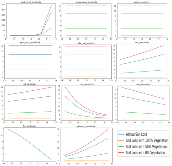 The soil parameters (sand, silt, clay, organic matter) also have significant effects on soil loss (Table 2); in particular, the clay ratio especially affects soil loss as higher clay in the soil allows it to maintain larger clumps which could reduce the impact of wind erosion [40]. Similarly, fractional vegetation coverage also has a significant effect on soil loss.