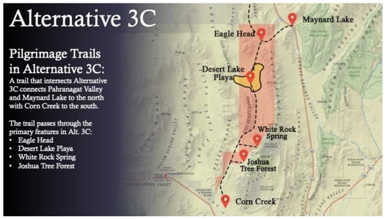 The proposed land transfer area that is the focus of this ethnographic analysis was designated Alternative 3C (Figure 2), which is one of three potential land expansions by the U.S. Air Force for the NTTR. The proposed expansions are to be evaluated by the U.S. Congress as a special kind of environmental impact assessment called a Legislative Environmental Impact Statement (that is a LEIS). If approved by the U.S. Congress, most of the Desert National Wildlife Refuge (DNWR) would be transferred from its current management by the U.S. Fish and Wildlife Service and become a military air and land use area for the NTTR [35].
