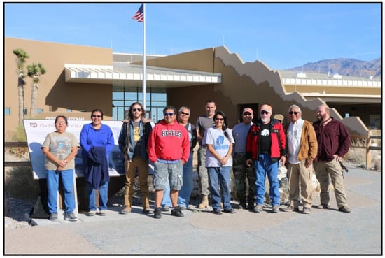 The field portion of the LEIS study in area 3C began in December of 2018 in a large conference room at the Corn Creek Headquarters for the DNWR (Figure 4) [37]. At this orientation meeting, the CGTO Writers Committee representatives received a welcome by the DNWR Superintendent, a visit to the interpretative museum, a presentation by the DNWR archaeologist, and a hard-back field notebook containing maps and descriptions of each site to be visited. In the notebook were Data Collection forms specially designed to be filled out in writing by each member of the Writers Committee at study sites. A form designed to organize potential observations was provided for each site. It contained resource topics that had been approved by Native representatives in previous studies. In addition, each member of the Writers Committee was provided with a voice recorder that could be used to document their thoughts while walking to and from the study area sites. Individual observations, both written and recorded, were supplemented by an end of day circle discussion by the whole Writers Committee. These circle discussions were open ended but focused on collective observations.