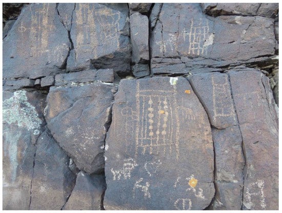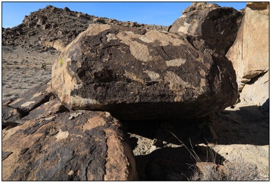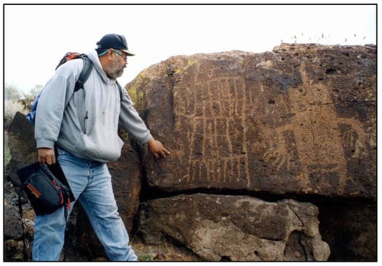 - Stoffle, R.W.; Van Vlack, K.; O’Meara, S.; Arnold, R.; Cornelius, B. Incised Stones and Southern Paiute Cultural Continuity. J. Calif. Great Basin Anthropol. 2021, 41, 19–36. [Google Scholar]