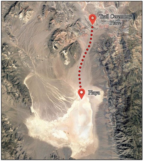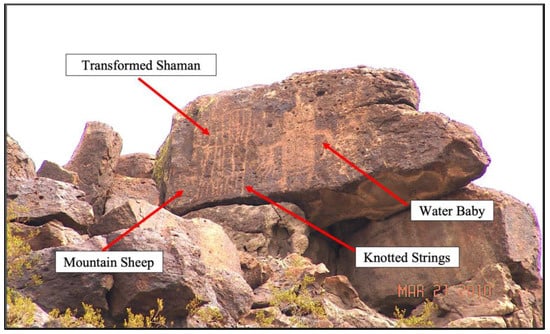 Especially well documented as a sacred trail marker are the knotted string images, called tapitcapi (literally “the knotted”), in Paiute. Such strings were sent out by medicine men or community leaders via a runner to people in distant communities to inform them of special events [61]. Tapitcapi are similar to Khipus (twisted cord) used by the Inca religious elite and leadership in the Andes [62]. Perhaps the best account of these spiritual runner trails is provided by Laird who married one of the last Chemehuevi Paiutes ritual runners [61]. Such runners could move along these trails without time elapsing. The special trails were specifically created. The trails were complex because they passed from water source to water source across the rugged terrain of the Mohave Desert and Colorado Plateau regional landscapes, but they also involved portals so the runner could travel through other dimensions. Often trails were traveled at night. To remember the trail routes, runners would sing a song that told the way. These trail songs described the path to be followed, as well the time it should take, and encouraged the runner by recounting stories of mythic beings who traveled or established the same trail. The trail songs were so critical that ownership was limited to specific individuals and families who maintained the songs and passed them from generation to generation as a heritage [61].