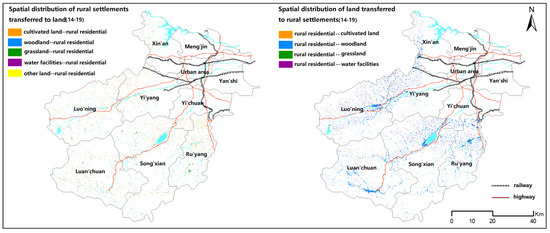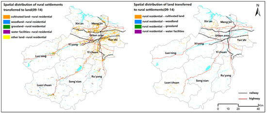 - During 2009–2019, the rural population of Luoyang region continued to decrease, while the scale of rural residential land first increased and then decreased. Per capita rural residential land in Luoyang region reached 225.02 m2/person in 2014, with a trend of serious imbalance in the relationship between people and land. This value decreased to 180.7 m2/person in 2019, with a slightly lower imbalance. During this period, the main outward flow of rural residential land was arable land, forest and garden land, and other land, while the inward source was mainly arable land, forest, and garden land and grassland. These were focused around the central city.