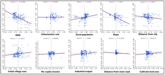- The relationship between rural people and land in Luoyang region is spatially correlated. However, under the combined influence of different environmental and socio-economic factors, the spatial distribution of rural residentials exhibits significant geographical differentiation. The bivariate spatial autocorrelation and the spatial autoregressive model illustrated that the drivers that promote the coordinated development of human-land coupling are, in order of influence, as follows: initial size of rural residentials > arable land area > rural resident population > industrial output value. Similarly, the drivers that cause an imbalance in the type of human-land coupling are, in order of influence: slope > elevation > distance from the city.