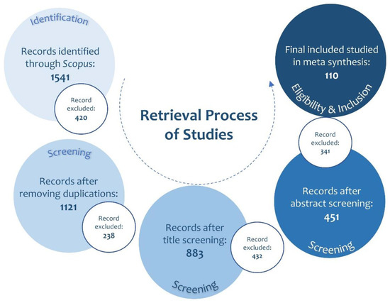 Following the collection of papers, the second phase (document assessment) was followed by five steps (Figure 1). The initial collection of 1541 studies based on the searched database was reduced to 1,121 after duplications were removed. By eliminating ambiguous or irrelevant titles, the data set was reduced to 883 records. Subsequently, 432 records were excluded through abstract screening yielding 451 pre-final records. These records were centered on LULCC, providing the basis for an additional bibliometric study. The principal eligibility criterion (encompassing the driving reasons for LULCC) was used to generate the final data set list of research encompassing 110 articles for a full-text content analysis in order to develop the study’s synthesizing themes and conceptual model. The data was last updated on 20 June 2022.