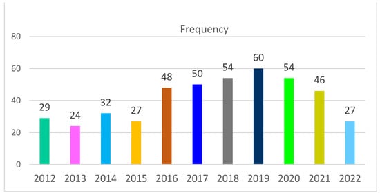 The number of papers published annually varied from 2012 to 2022, but it witnessed a rise as of 2016 with 48 articles, and reached a peak in 2019 with 60 published articles. Figure 2 depicts the annual trends in publications on this topic based on a sample of 451 articles gathered on 25 June 2022.